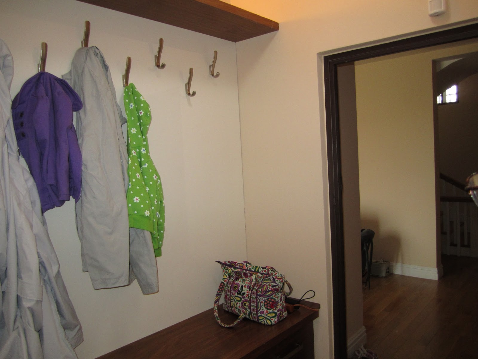 When you enter our house, you come into a tiled foyer. On your right is a door to the garage—possibly big enough for a car, but a tight enough fit that we may just use it for storage. On your left is a built-in with cabinets and drawers for storing shoes, umbrellas, gloves, hats, scarves … and hooks on the wall above it for coats. Very practical!